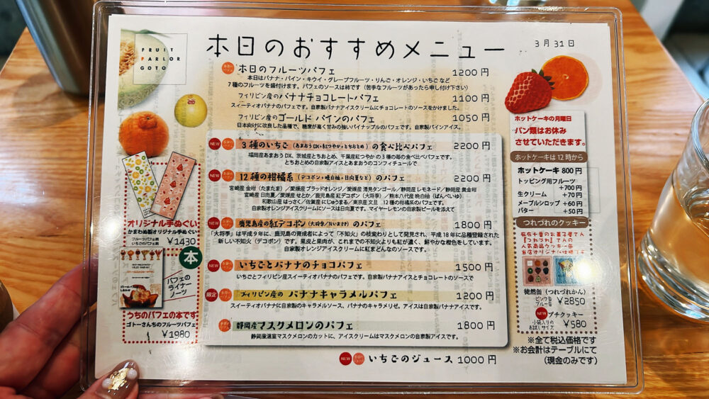 店家的最大特色,在於所使用的水果全都是當天一早從市場精心挑選而來,保證新鮮度與品質。有時甚至能品嚐到罕見的日本在地水果,例如香氣濃郁的蜜柑或珍稀的白草莓。