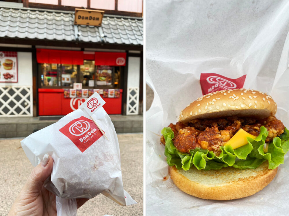 走进花屋敷游乐园分店,映入眼帘的便是那张存在感十足的螃蟹堡照片。招牌汉堡直接将一整隻酥炸软壳蟹夹入麵包中,金黄酥脆的麵衣包复着完整蟹身,蟹脚甚至大剌剌地从汉堡里伸出来,彷彿在向你挥手打招呼。特别适合穿着八重和服拍照打卡,昭和风游乐园背景加上浮夸汉堡,画面感十足。咬下第一口,外壳爽脆、内里蟹肉鲜甜,再搭配 DomDom 特製的甜辣酱与柔软的汉堡包,浓郁的海味在口中瞬间绽放。